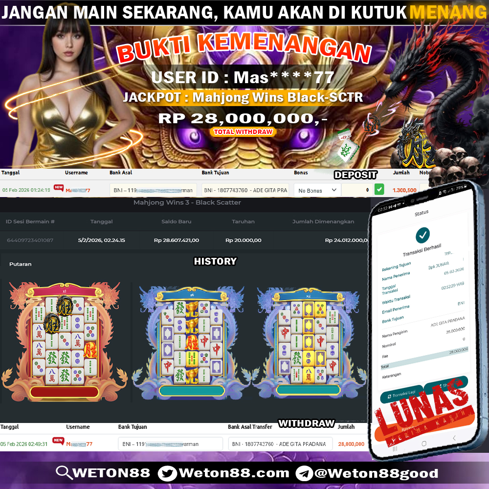 Dimana Lagi Anda Dapat Situs Slot Online Sekarang Yang Terpercaya Seperti WETON88 ? Kemenangan Member Di Proses Tanpa Bertele-tele, Jadi Tidak Perlu Anda Merasa Khawatir Pada Agen Situs Bandar Slot, Bola, Bandar Togel, Live Casino Seperti WETON88. Karena Kemenangan Besar Berapapun Akan Di Bayar Lunas Kepada Member/Gamers.